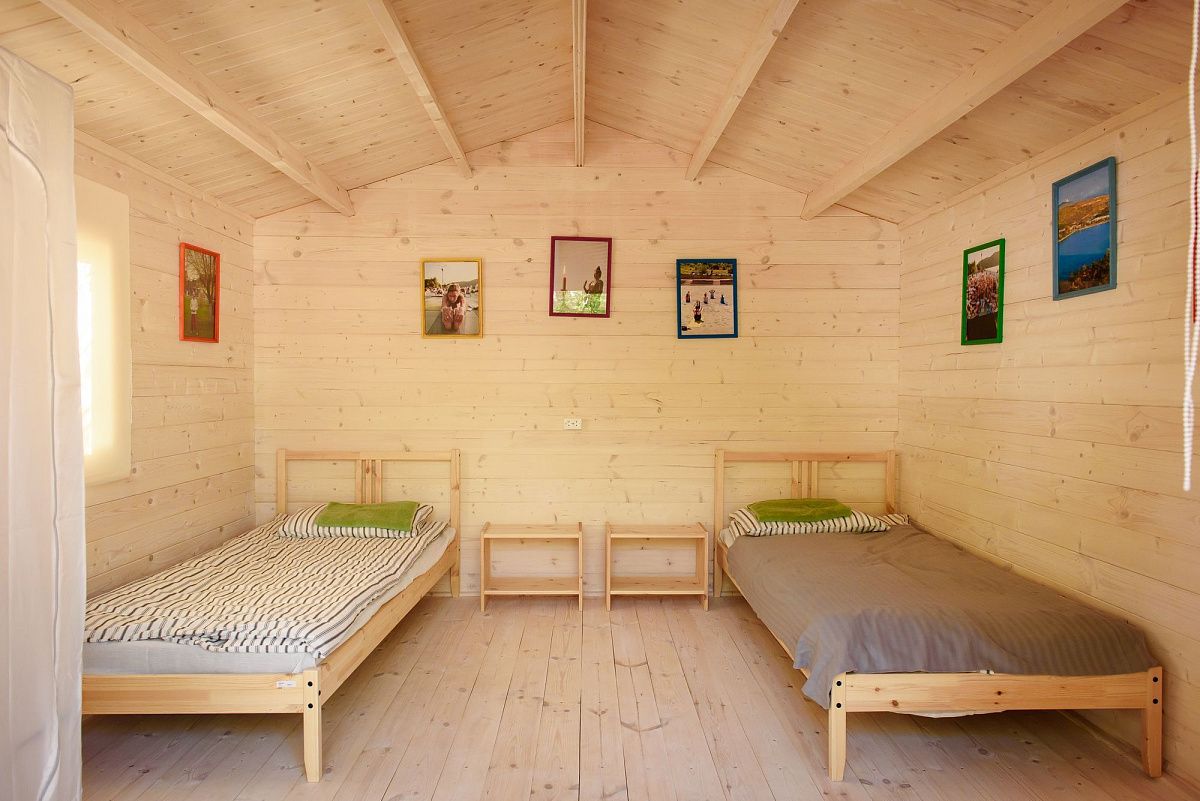 - Оснащение домиков: две односпальные кровати, две тумбы, шкаф