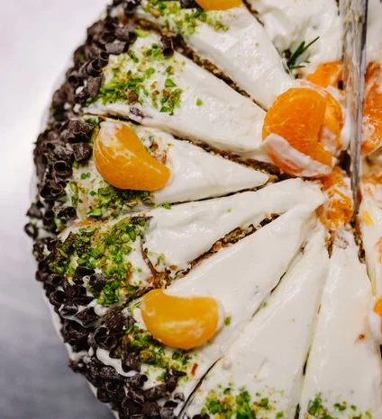 - Мусс из ряженки с апельсином в фруктовой глазури и песочно-ореховой крошкой.