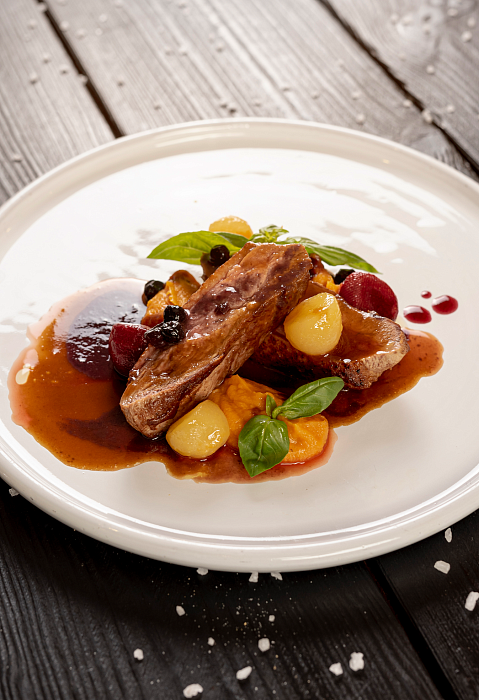 - Свекольное орзотто с белыми грибами, утиным филе и вяленой грушей;
