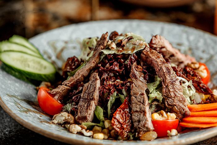 - Теплый салат с говяжьей вырезкой в пряном соусе;