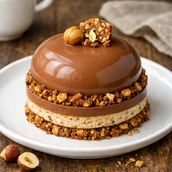 Ореховый: Антреме с дакуазом, крамблом из фундука и сливочно-шоколадным муссом.