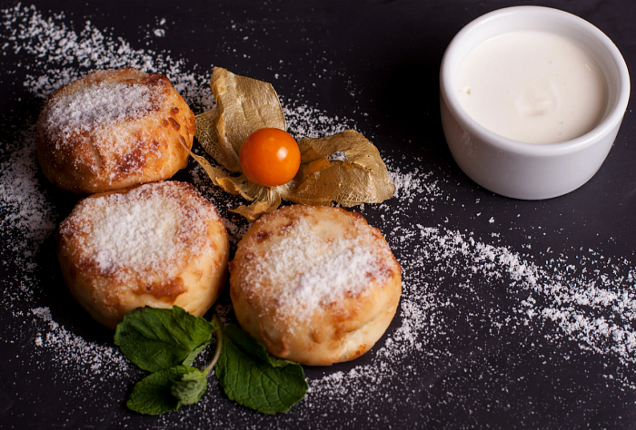 - Сырники с клубничным вареньем и сметанным кремом.
