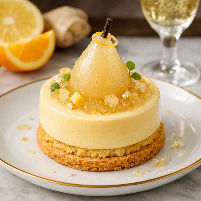 Цитрусово-имбирный: Антреме с лимонным сабле, цитрусовым муссом и грушей в шампанском «Абрау-Дюрсо».