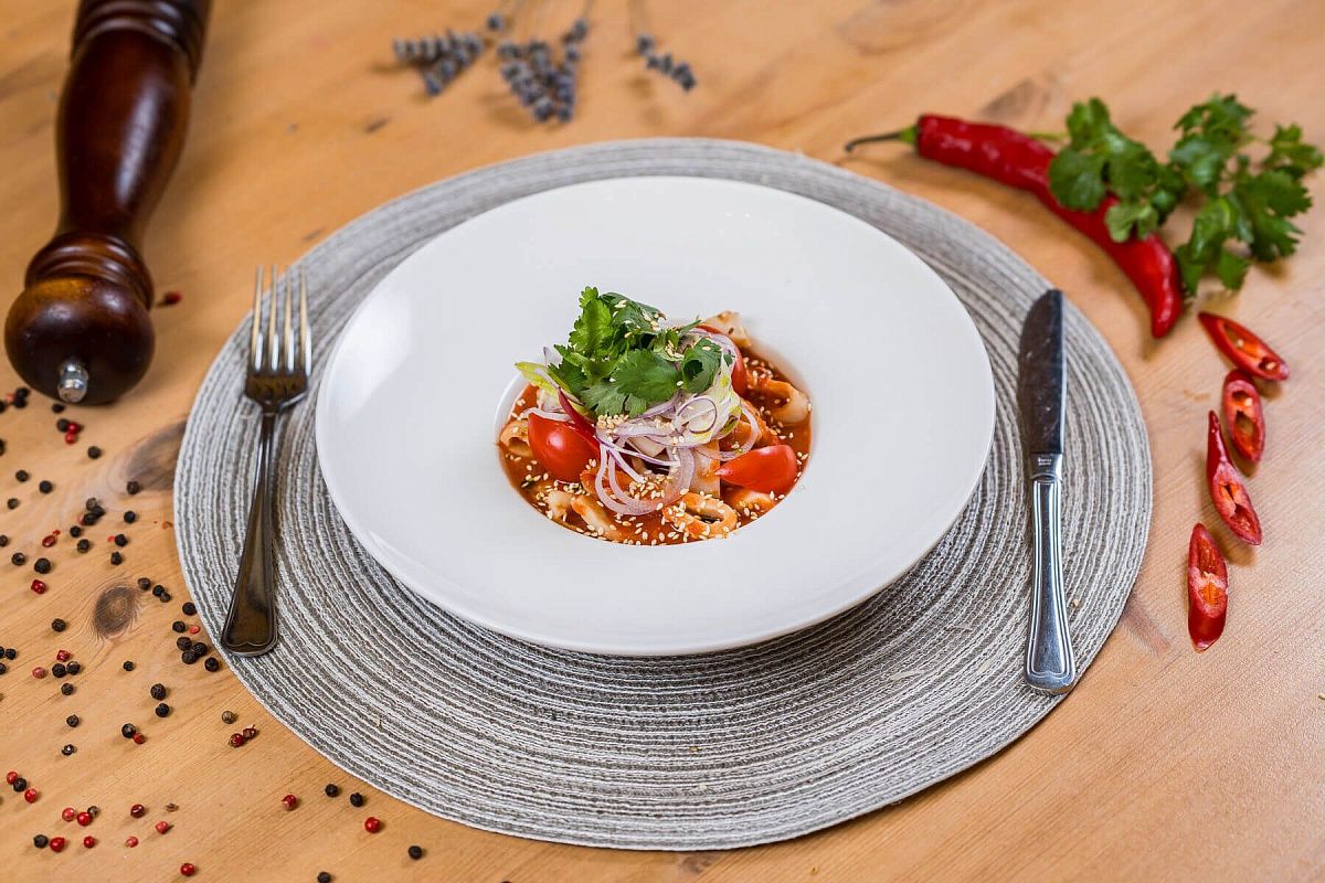 - Паста с морепродуктами, томатами и ароматными приправами.