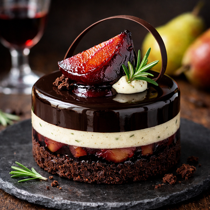 Шоколадно-грушевый: Антреме с темным шоколадом, грушей в портвейне и муссом из белого шоколада с розмарином.