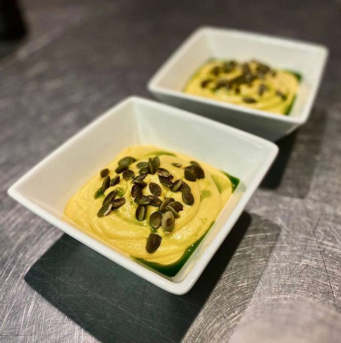 - Суп капучино из тыквы с сыром страчателла и жареными семенами;